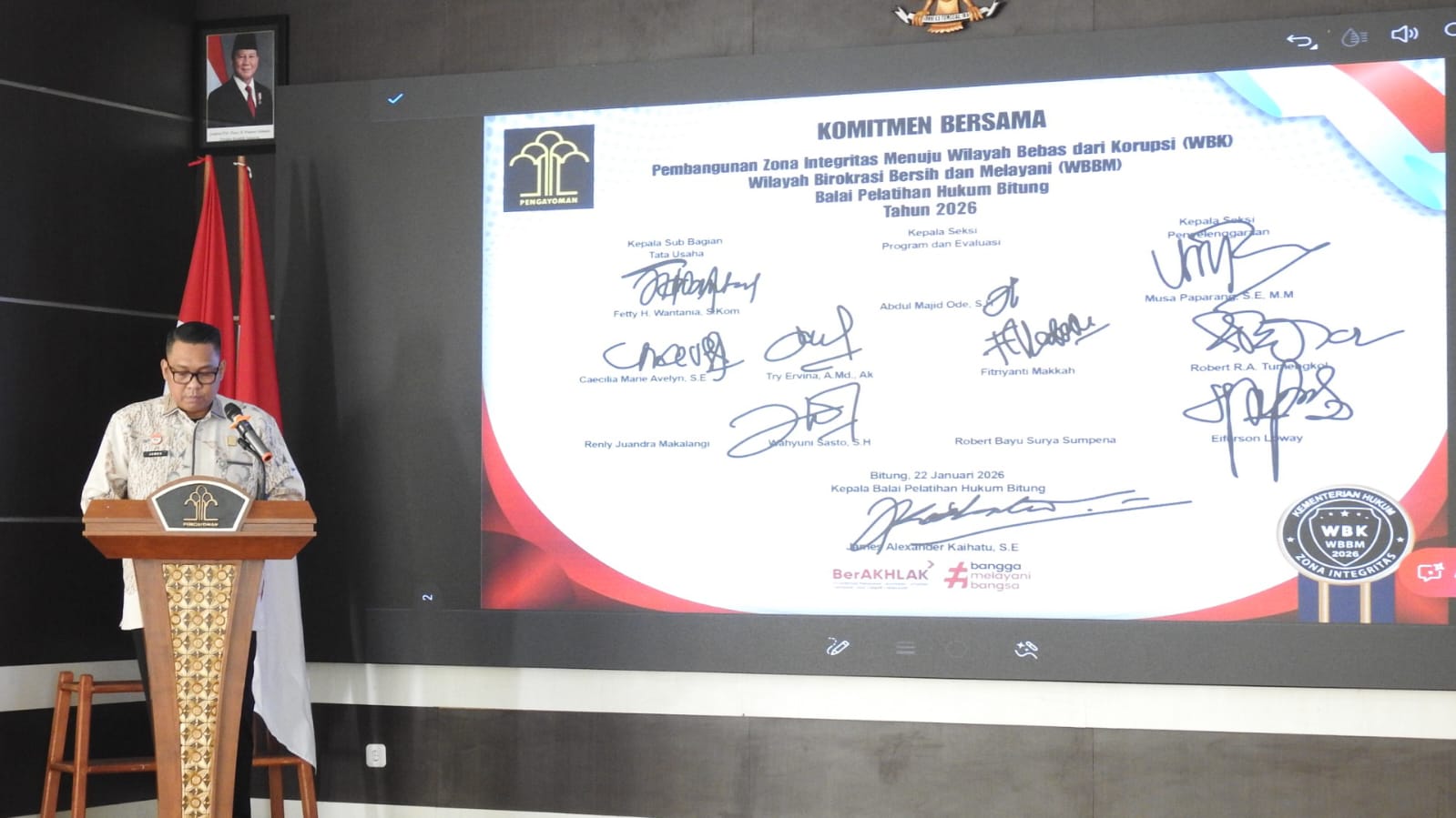 manadosiana.net, BITUNG – Balai Pelatihan Hukum (Bapelkum) Bitung tancap gas mengawali tahun 2026. Tak tanggung-tanggung, komitmen pembangunan Zona Integritas (ZI) menuju Wilayah Bebas dari Korupsi (WBK) dan Wilayah Birokrasi Bersih dan Melayani (WBBM) resmi dicanangkan, Kamis (22/1/2026).