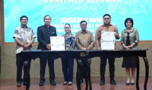 Minahasa, ManadoSiana – Bupati Minahasa Robby Dondokambey, S.Si., MAP bersama Wakil Bupati Minahasa Vanda Sarundajang, S.S menghadiri Pelantikan Pengurus Persatuan Wartawan Indonesia (PWI) Kabupaten Minahasa Periode 2026–2029. Kegiatan tersebut digelar di Ruang Sidang Kantor Bupati Minahasa, Jumat (27/02/2026).