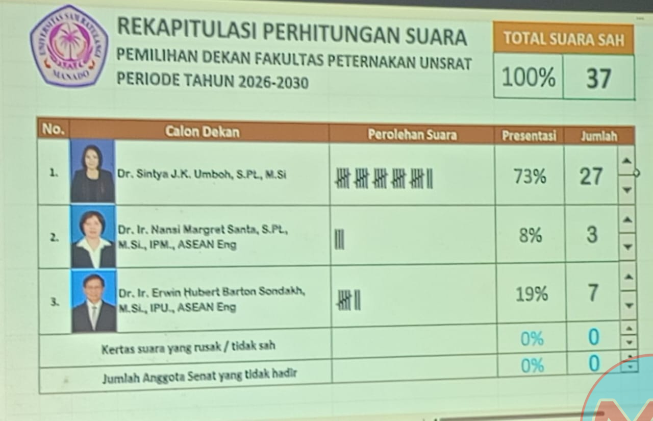 manasosiana.net, MANADO – Fakultas Peternakan Universitas Sam Ratulangi (Unsrat) Manado memiliki pemimpin baru. Dr. Sintya JK Umboh, S.Pt., M.Si., secara resmi terpilih sebagai Dekan Fakultas Peternakan untuk periode 2026-2030 dalam pemilihan yang berlangsung pada Rabu (10/12/2025).