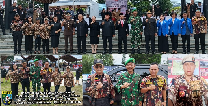 Minahasa, ManadoSiana- Dalam rangka memperingati Hari Sumpah Pemuda ke-97 Tahun 2025, Komandan Kodim 1302/Minahasa Letkol Inf Bonaventura Ageng Fajar Santoso bersama Kasdim Mayor Inf Daeng Pasaka, S.E., melaksanakan upacara peringatan di dua lokasi berbeda, Selasa (28/10/2025).