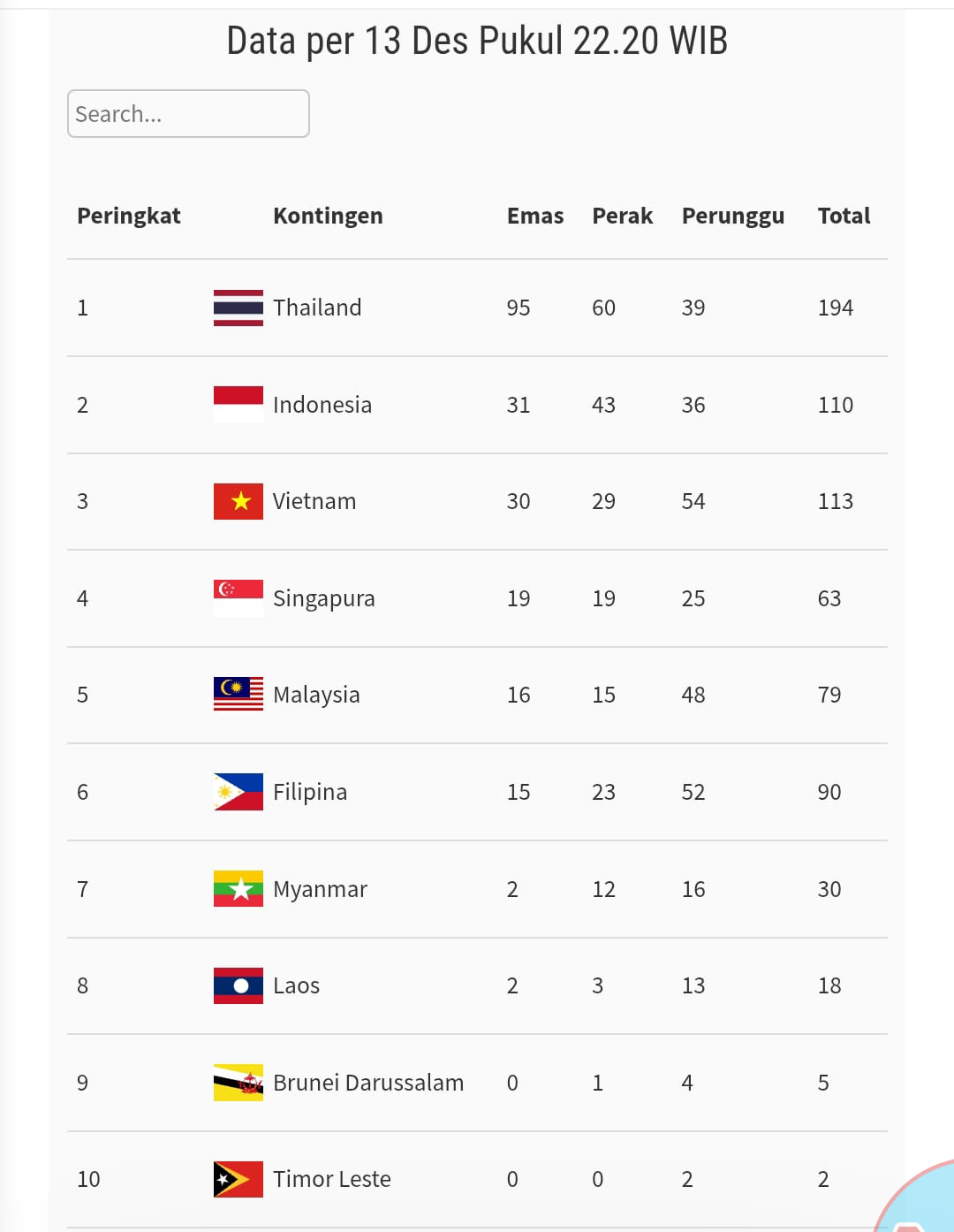 Dengan perolehan fantastis tersebut, Indonesia kini mengoleksi total 31 medali emas, 43 perak, dan 36 perunggu. Posisi ini menempatkan Indonesia tepat di bawah Thailand, sang tuan rumah, yang memimpin jauh dengan 95 emas, 60 perak, dan 39 perunggu.