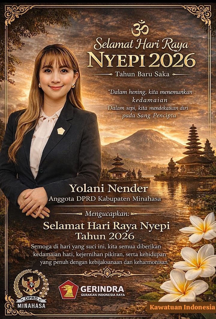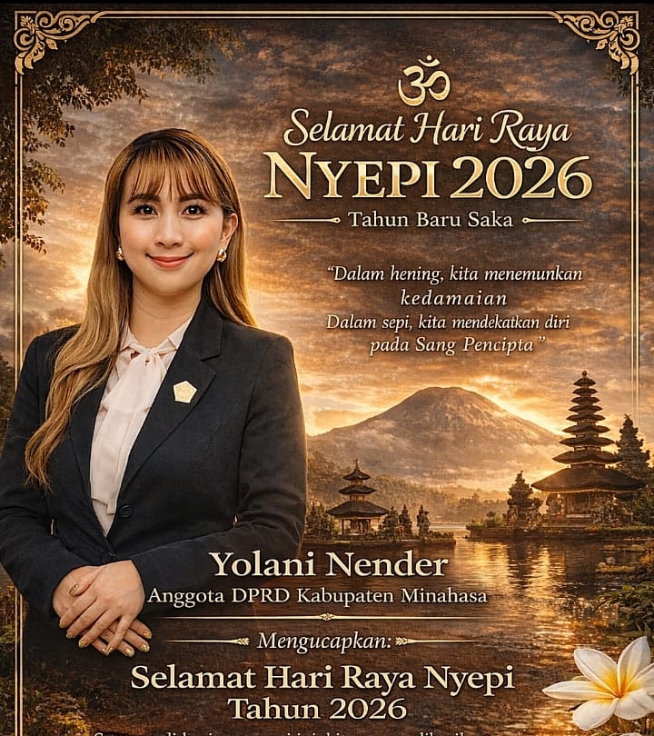 Saya, Yolani Nender, Anggota DPRD Kabupaten Minahasa, mengucapkan Selamat Hari Raya Nyepi Tahun 2026. Semoga di hari yang suci ini, kita semua diberikan kedamaian hati, kejernihan pikiran, serta kehidupan yang penuh dengan kebijaksanaan dan keharmonisan,ujarnya.